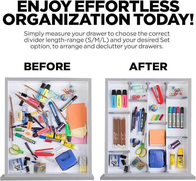 - UPGRADED VERSION 2024 | MEASURE YOUR DRAWER LENGTH FIRST | For the best organizing experience, be sure to measure the depth/length of your drawer (from the front of the drawer to the back) in order to select the correct divider length-range (S/M/L). Ordering the correct size enables you to start decluttering your kitchen utensils, office supplies, junk drawer, utility drawer, crafts, and more sooner!