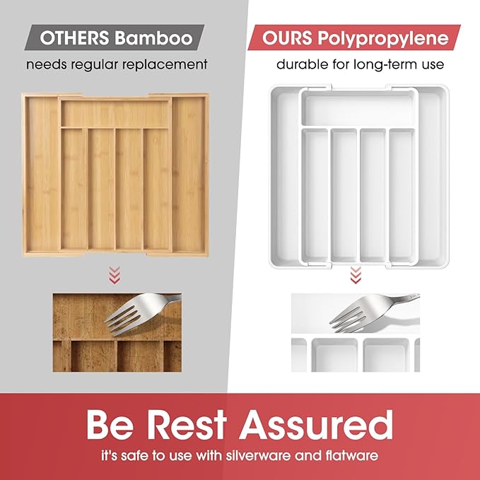 - SAFETY MEETS DURABILITY: AUJEN drawer organizer for kitchen utensils is crafted from premium PP material that is BPA-free and durable for use. Just rest assured that it can guarantee the safety of all your utensils, silverware, and flatware. Cleaning is as easy as a breeze - simply rinse with water or wipe with a damp cloth.