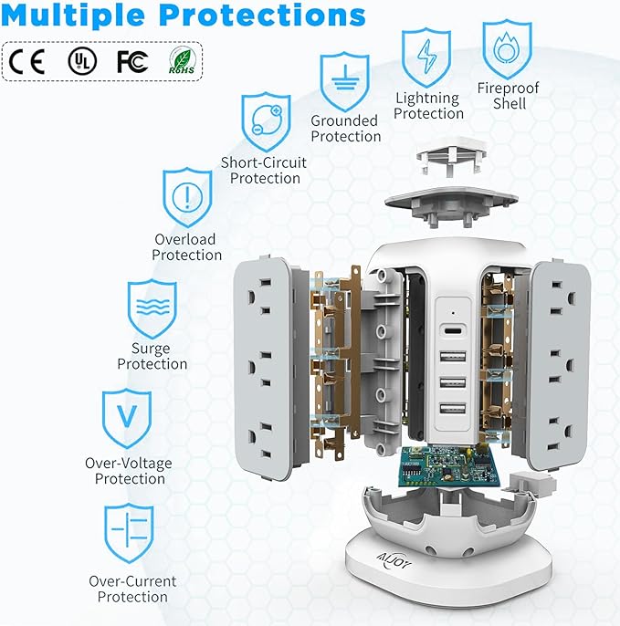 - 1200J Enhanced Safety Features: Power strip surge protector has passed FCC, RoHS certification, this surge tower has surge protection, overload protection, short circuit protection, lightning protection. The power tower charging station use the ceramic SPD to automatic cut off the power fastly when voltage surge is detected, to ensure you a safe charging environment; The power tower has a reset button, in case the maximum voltage is exceeded and the unit shuts down