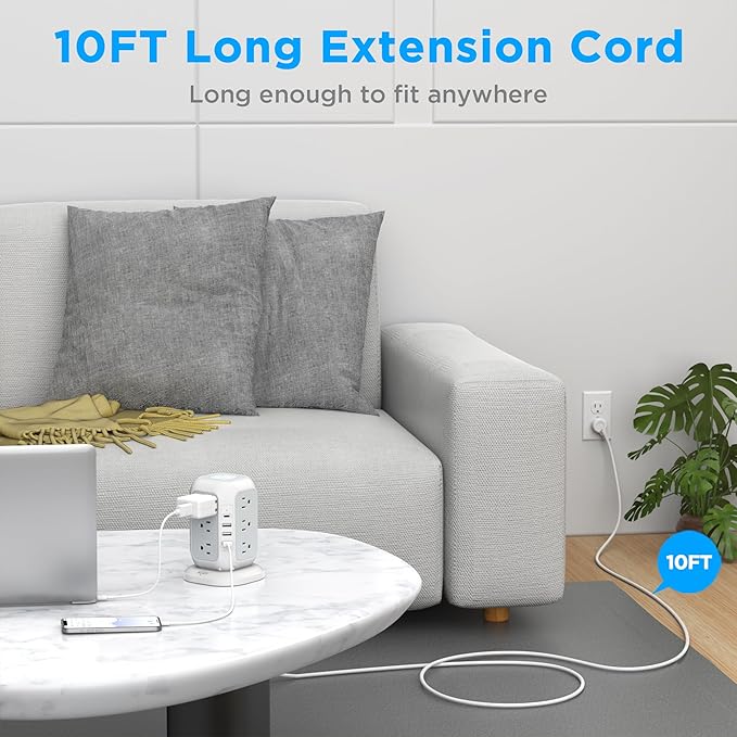 - 10 FT Extension Cord with Stable Construction:The power surge protector extension cord 10FT long extension cord can give you more flexibility in small space; The power strip with USB ports is very solidly constructed, inspiring confidence in the unit's safety; The vertical design of this power strip tower is much better than a traditional horizontal strip for the relatively large power supplies you need to plug in