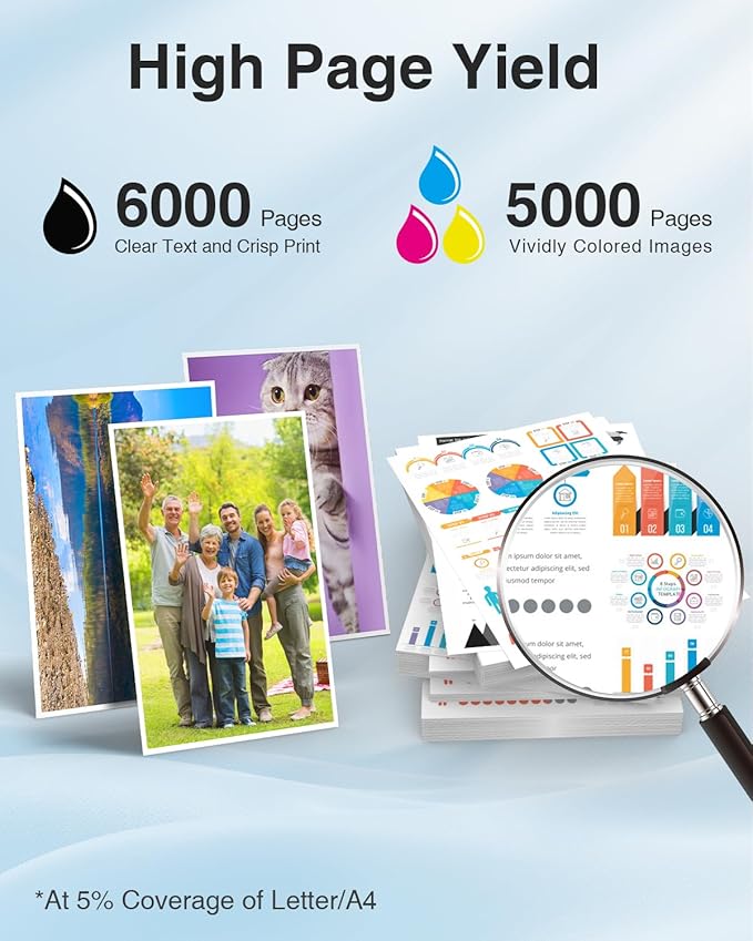 - 【High Page Yield】Upgrade high yield ink cartridges. UP to 6,000 pages per LC406XL black ink cartridge, and 5,000 pages for LC406XL color ink cartridge (Letter/A4, at 5% coverage).