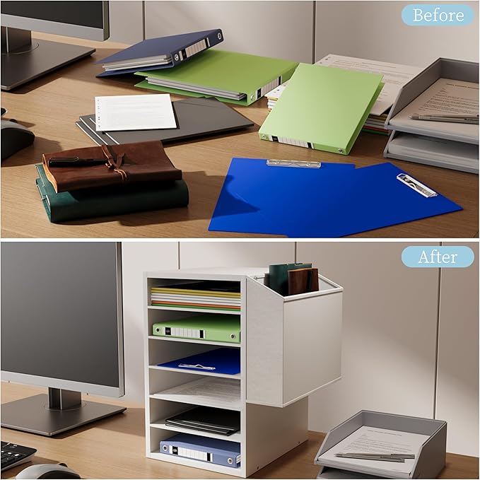 - Durable & Stylish: Say goodbye to cluttered desktops with Unionly 11.81"x10.4"x16.14" wood literature organizer. Crafted from sturdy, eco-friendly MDF wood, the paper sorter offers longevity. Lightweight and fully finished, the sleek design provides durable storage while enhancing your decor