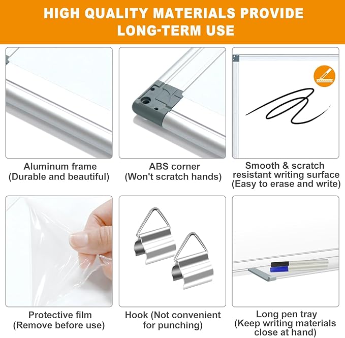 - The dry erase white board is made of high grade sturdy aluminum frame built with ABS plastic corners, no worry about pointy edges.