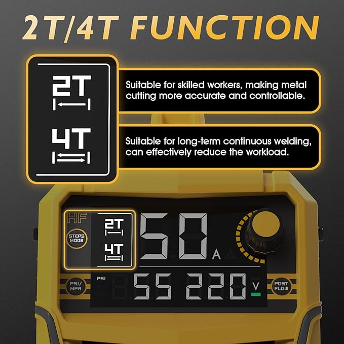 - Post-flow time can adjust from 5-8 seconds to cool welding head to extend the life of consumables. Also can select 2T/4T to have a comfortable working experience.