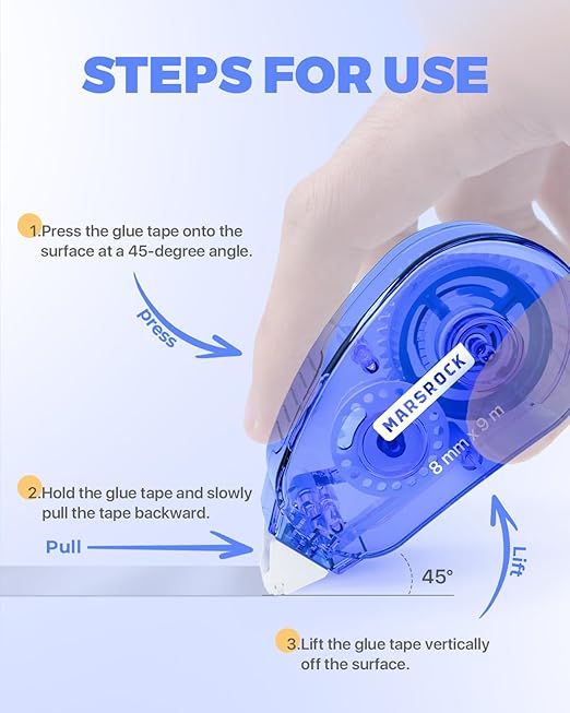 - Easy to Operate: The Marsrock tape glue runner provides effortless convenience with its user-friendly design. Featuring a straightforward three-step process—press, pull, and lift—it simplifies adhesive tasks, ensuring smooth and easy application. Ideal for quick and hassle-free crafting, this tape glue runner is your perfect choice for efficient, streamlined projects