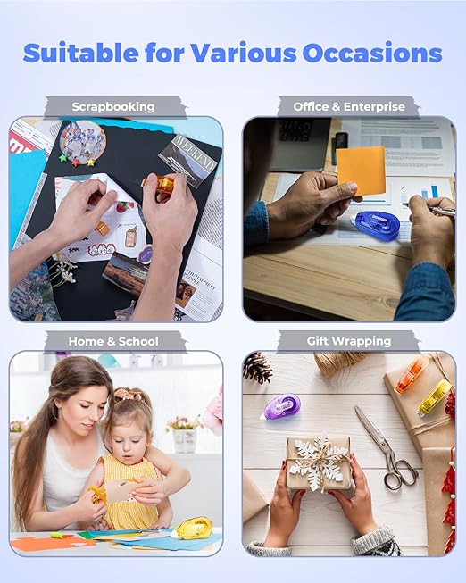 - Versatile Use: Our glue tape is ideal for DIY crafts, cardmaking, gift wrapping, and office projects. This double-sided tape roller acts as both a dispenser and scrapbook glue tape, providing a clean, professional finish. Whether for crafts, scrapbooking, or general use, it ensures precision and ease