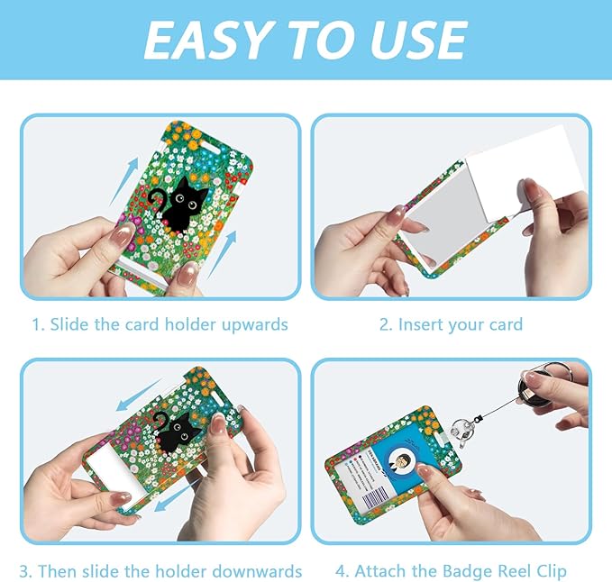 - Novelty Badge Reel: This cute badge reel is designed with flower black cat arts. The heavy duty badge reel will always bring more happiness and fun to your life. The set includes a detachable lanyard, heavy duty badge reel, and card holder, great for personalizing your work accessories