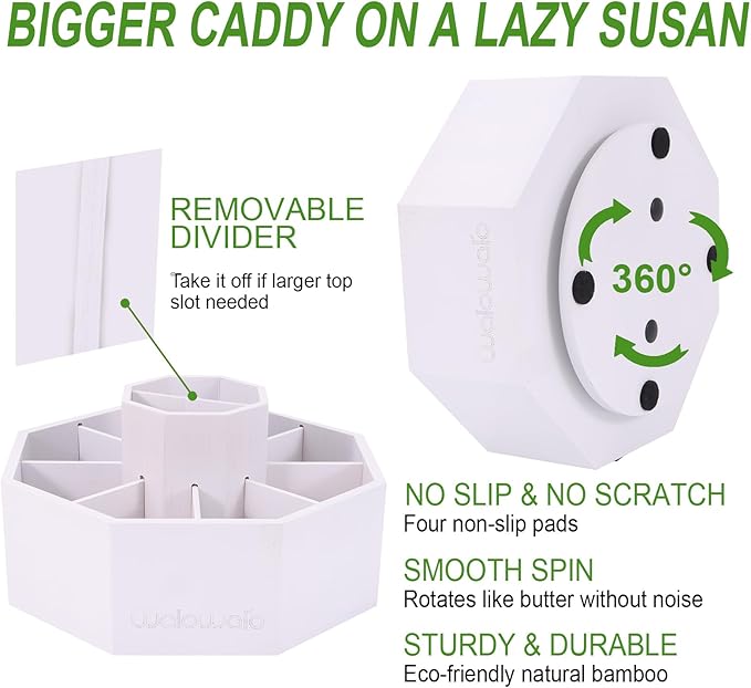 - BAMBOO PRODUCT - You will like the natural bamboo design. The rotating caddy fits for different style of decor. Also, available stained or painted if you prefer to.