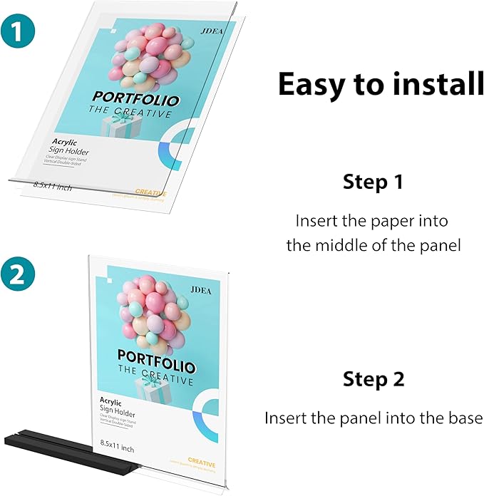 - Easy to use: print your content onto paper, insert it into the acrylic panel, align the triangular edges of the panel with the triangular slots of the base, and gently push into the base.