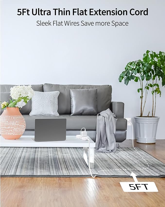 - 【Meet Your Need】-A 5-foot flat extension cord allows it easy to use in all sorts of different areas for plugging it in within the reach of your electrical product. You even can’t feel it under the carpet. So it's easy to run it under a rug or along walls without adding unsightly bulk or creating a trip hazard.