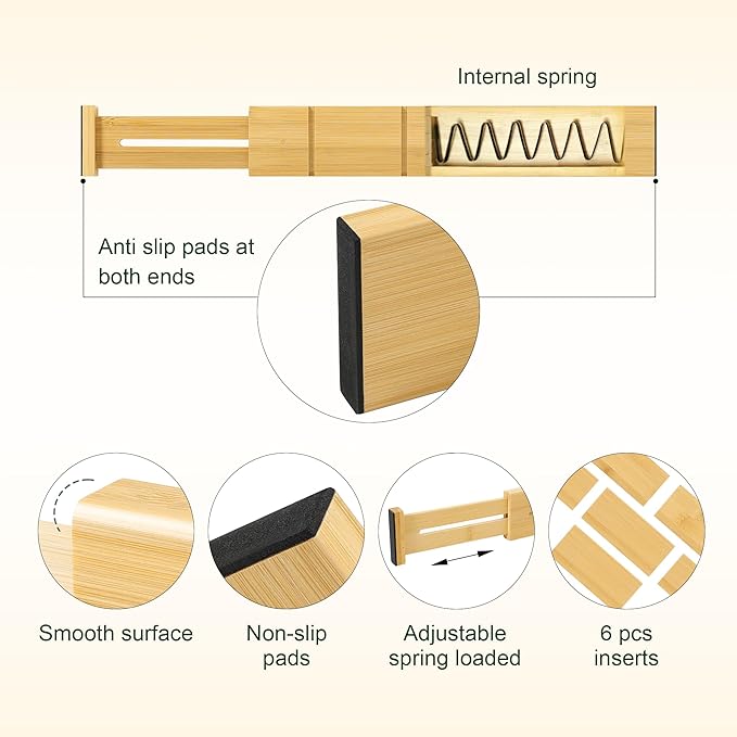 - 4 Dividers with 6 Inserts: This drawer insert divider allows you to customize your own drawer. The small inserts can be easily inserted to make smaller or larger storage parts for you to store utensils, socks, clothes, or office items