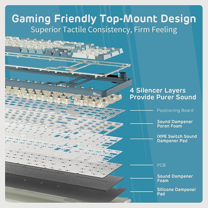 - Sound Absorbing Foams - Equipped with IXPE switch dampener pad, 2 layers of thicker sound-absorbing foams, silicone dampener pad, which reduces 40% noise and removes 80% hallow sound. Bringing creamy or thocky sounding, natural and clear feedback, no more cavities noise.