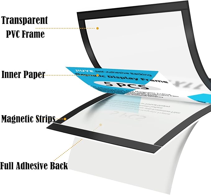 - Simple Structure : JIUYE adhesive frame is laminited structure,composed of 2 layers traslparent plastic sheets,soft iron and magnetic strips.Working through magnetic attraction to hold document paper.