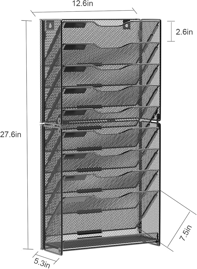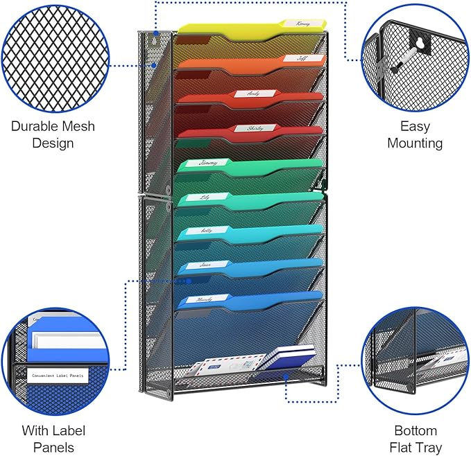samstar 10 Tier Wall File Organizer, Hanging Wall Mount File Holder Paper Folder Mail Organizer, Mesh Metal, Black.