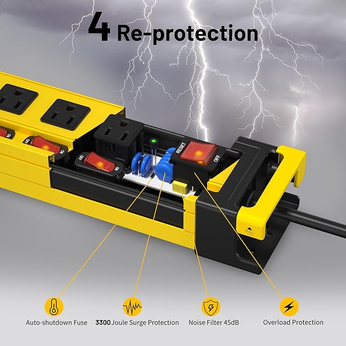 - 3300 Joule Surge Protector--This heavy duty power strip features a 3300 Joule surge protector with built-in EMI,15-amp circuit breaker,and thermal fuse that protects equipment from spikes and overcurrent damage,providing maximum protection