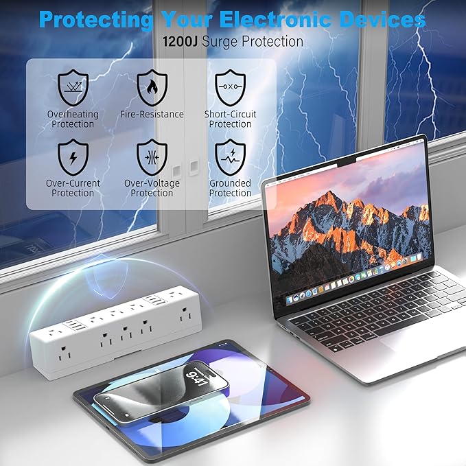 - 【1200J Surge Protection】-Made from fire-resistant ABS plastic, this desk plug station features a built-in circuit breaker for overload, short circuit, and overheat protection, effectively handling voltage spikes, protecting your computer and accessories.