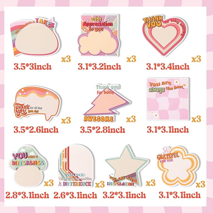 - Gift: This sticky notes set is a appreciation gift for employees, colleagues, teachers, friends,classmates, family and so on. It can be used for reminders on daily reminder, reading, textbooks, cookbooks, journal, office files, computer, desk, doors, windows, walls, fridge and so on, make your daily life easy