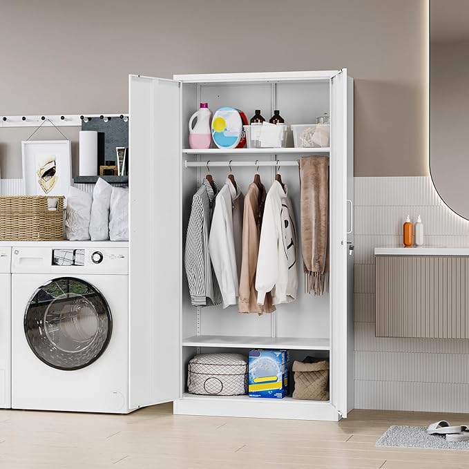 - 【Upgraded Metal Wardrobe Cabinet】: This metal cabinet add storage space in overall size: 72"H x 36"W x 18"D. The Closet Rod is made of aluminum alloy material, and it can hang more than 10 pieces of long coats. Furnished height-adjustable steel shelves, it can also accommodate bedding, luggage, cleaning supplies and tools.