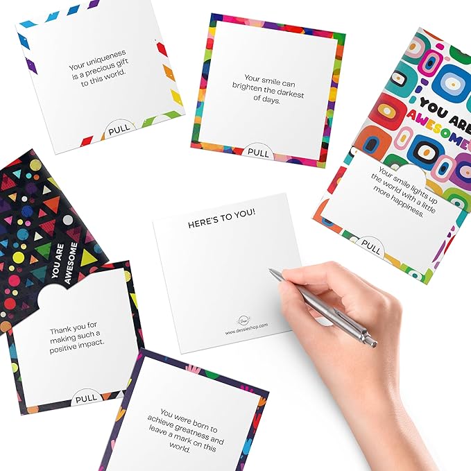 - 🦋Engaging Pull-Out Design & Perfect Size: Our 2.5x2.5 inch cards boast a playful and interactive pull-out design, perfectly sized for discreet surprises or pocket-sized inspirations. Their compact size makes them ideal for slipping into everyday places like lunch boxes, wallets, books, or next to a coffee mug on a coworker’s desk, offering an unexpected moment of joy and motivation.