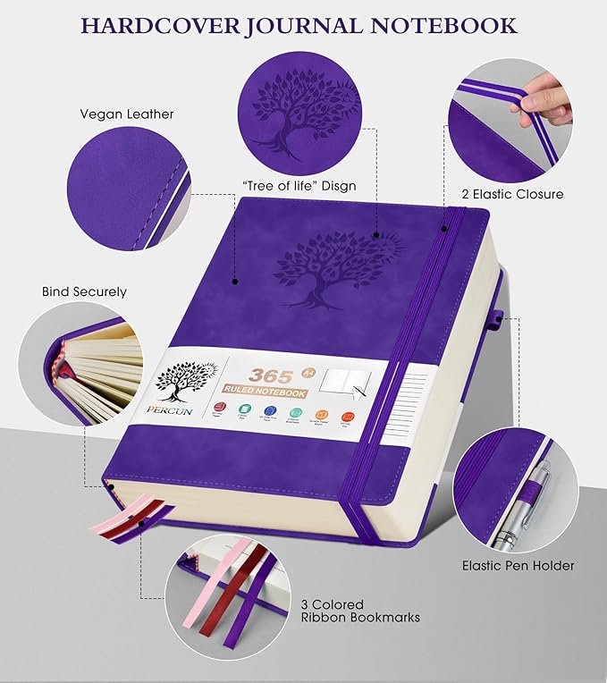 - 【180°Lay Flat for Writing】Our notebook also comes with 180°Lay Flat Journal Notebook, which makes writing a breeze. The elastic pen holder and bookmark ensure that you never lose track of your pen, and the 2 elastic closures ensure that your journal stays securely closed. The 3 colored ribbon bookmarks and 3 sticky labels provide even more ways to customize your journal to your liking.Built-in back pocket that is great for storing loose notes, cards, or other important items.