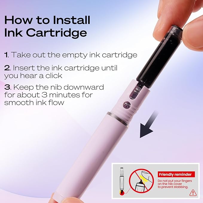 - Fine nib black ink, 1 retractable fountain pen includes 5 cartridges