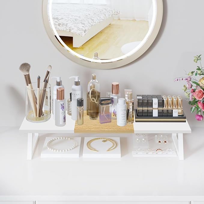 - 【Desktop Organizer】★The white wooden surface has a large and wide area, enough to accommodate monitors/laptops and docking stations, smooth and wearble. ★The storage space below can store keyboards, pens, books, earphones and other office supplies, also making cable management simple.