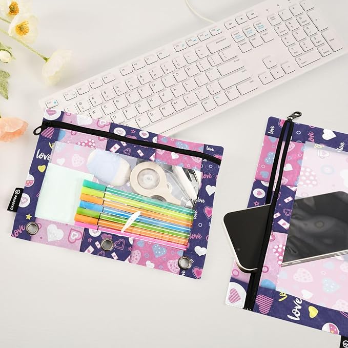 - 3 Ring Pencil Pouch: Zipper pouch with rivet enforced holes perfectly compatible with all standard 3 ring binders, widely used in college, school, office, home