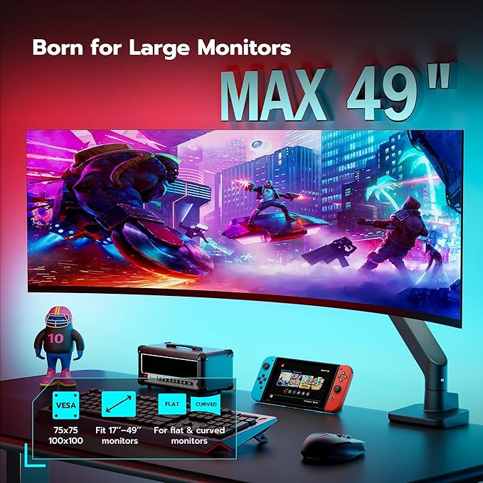 - 【Support up to 49" & 44lbs Monitors】The 49 inch monitor arm supports most flat, and curved computer screens ranging from 17 to 49 inches, holding 4.4 to 44 lbs. Compatible with Samsung Odyssey G9, LG, and other 49" ultrawide monitors, but needs to prepare a VESA mount adapter if your monitor does not have VESA holes. Equipped with 75x75mm and 100x100mm VESA mounting holes.