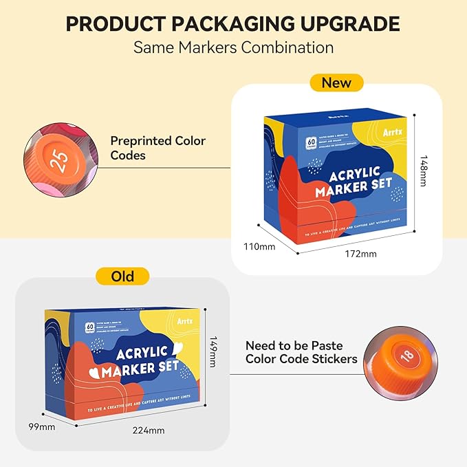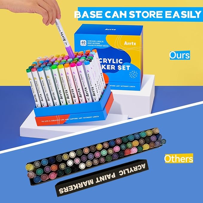 - Abundant Color Choice: The 60 new colors provides more new color shades for creativity, including 50 Regular Color, 4 Metalic Color, 6 Neon Color, Please note: When you open the package for the first time, the order of placing the acrylic markers is the same as the order of the color card stickers, just stick them in order.