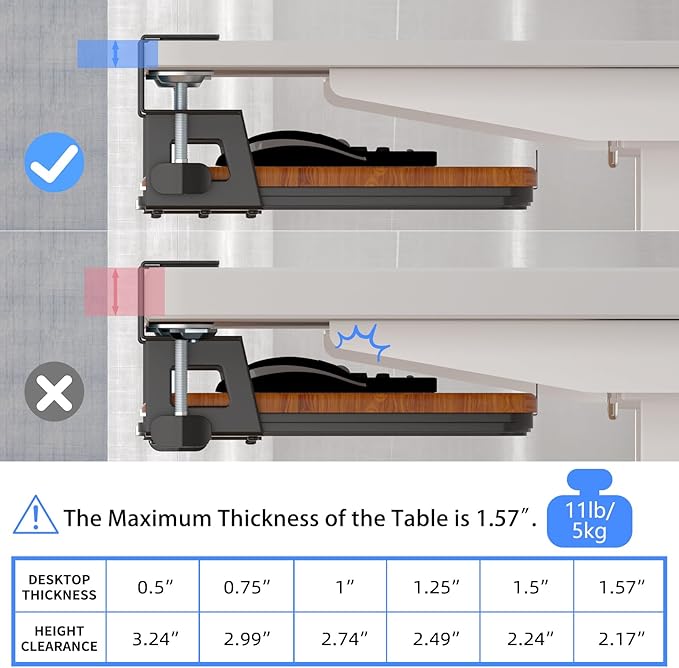- Sturdy - Dual Steel C-clamps can tightly fix to your desk and holds up to 11lbs. Non-slip pads prevent your desk from scratching. Edge stopper can stop keyboard from falling when pushing back.