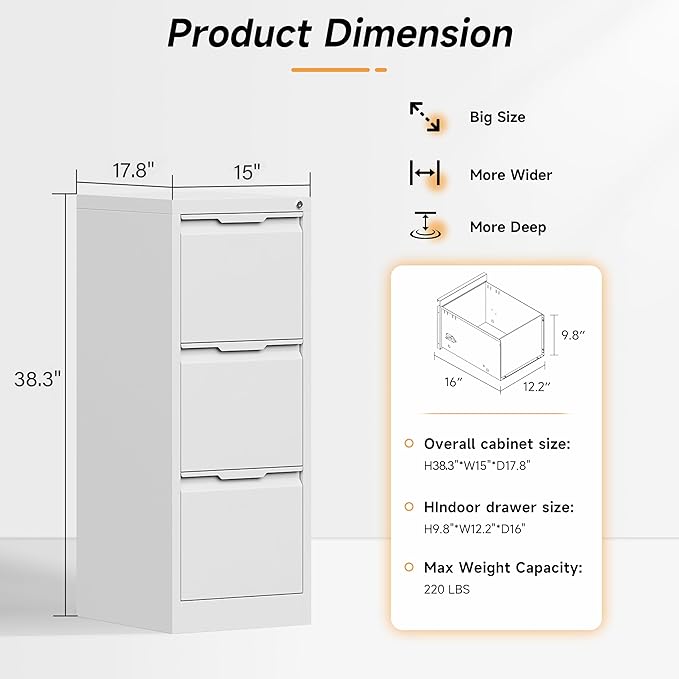 - 🛎️【SUPER FUNCTIONAL VERTICAL FILING CABINET】: Our this file cabinet has three large drawers with 15.7 inches depth, which provides you with large enough storage space. And it is equipped with adjustable hanging rods to store different types of files, such as letter, legal, A4, F4 size folders. It is perfect for you to customize the way you organize your files!