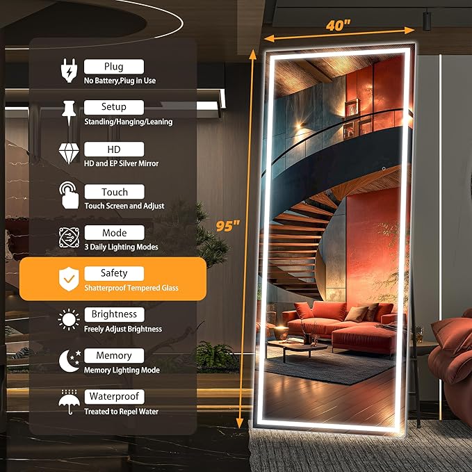 - 【Upgraded Tempered Glass】: Unlike other mirrors, the HASIPU LED floor mirror is designed with 5MM tempered glass. When damaged by external force, it forms small blunt particles in a honeycomb-like pattern, reduces the risk of serious injuries to humans. Additionally, tempered glass has a 5 times higher impact and bending strength compared to regular glass. Moreover, tempered glass also exhibits excellent thermal stability, capable of withstanding temperature changes up to 300℃.