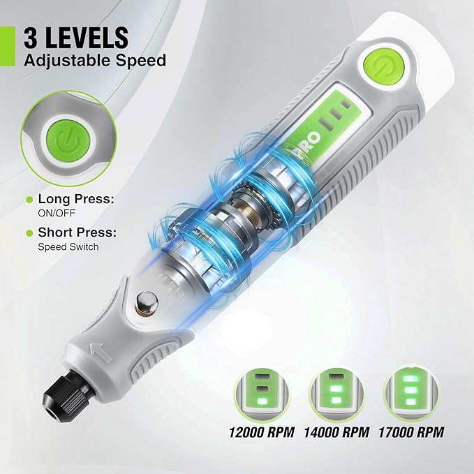 - Achieve safe and detailed work with efficient speed adjustment from 12000RPM to 17000RPM, this allows you to easily adapt to different scenarios with one button. Easy to control, even for beginners