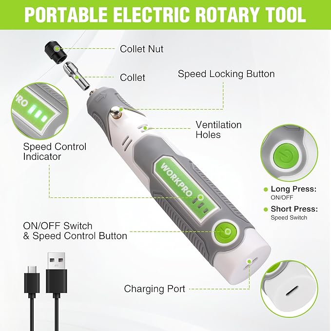 - Please LONG PRESS the button to turn ON/OFF. This electric rotary tool is a high-speed, low-torque tool, and it's Recommended for light duty applications on soft materials
