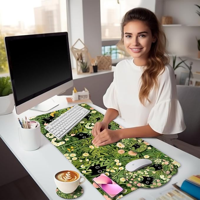 - Novelty design: Introducing the cat ergonomic mouse pad with wrist rest desk mat sets accessories. This cute anime mouse pad features a delightful design of black cats hiding amongst a lush green floral pattern, adding a touch of whimsy to your workspace