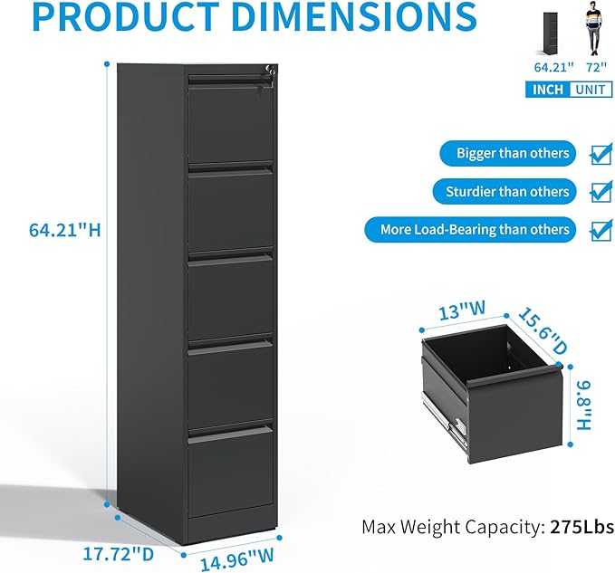 - 【Easy to assembly】This 5 drawer file cabinet is easier to install than others after we streamlining the installation process.The package of this steel filing cabinet include clear instruction manual and labelled parts, also you can find an installation video on product page, so you can easily identify and assemble the pieces without any confusion.If you encounter any issues, please email us to get our service team reply within one day!
