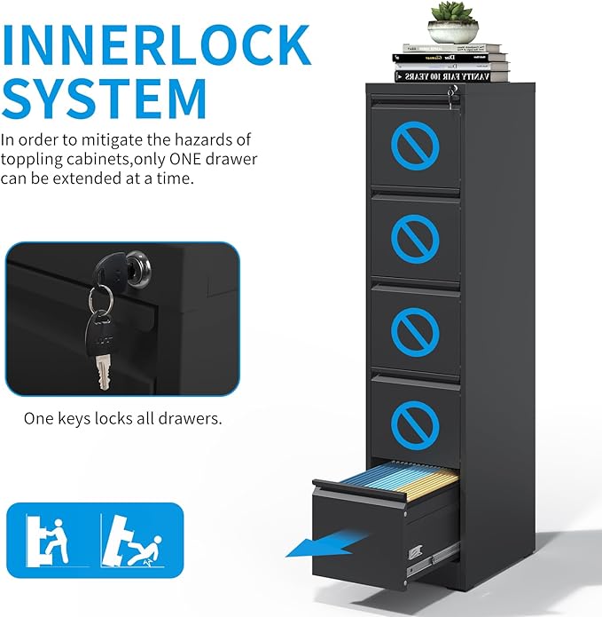 - 【Secure Locking System】This black file cabinet comes with one security lock and 2 keys, securing all your files. You can lock all the drawers at the same time, ensuring confidential documents and valuables remain protected from unauthorized access.Engineered with an anti-tilting mechanism, this narrow file cabinet allows only one drawer open at a time.The interlocking system enhances stability.