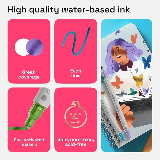 ARTISTRO 24 Metallic Dual-Tip Acrylic Paint Markers for Rock, Canvas, Glass, Wood, & More Fine + Dot Tips
