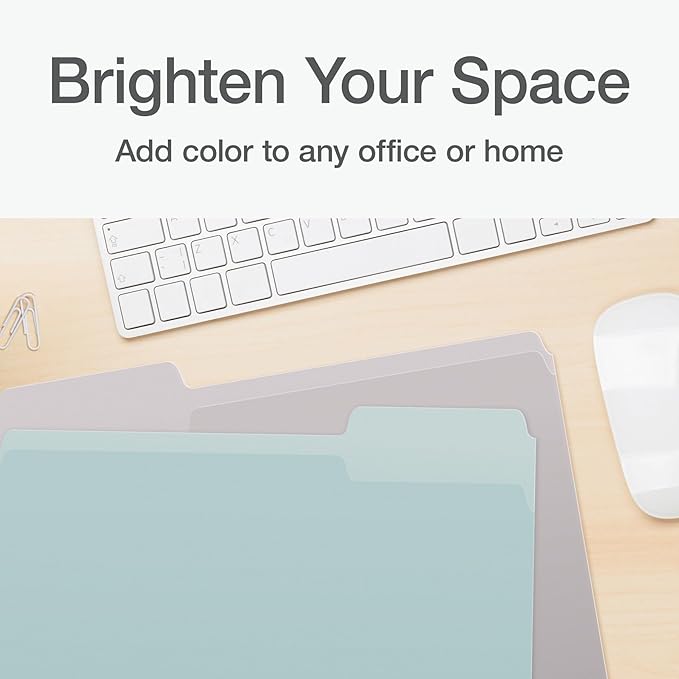 - Work faster and smarter; color file folders in calming pastels (khaki, peach, light blue and light green) let you spot the right file through color association
