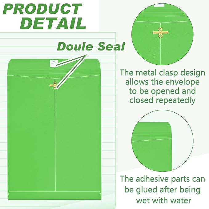 - Practical Sealing Mechanism: the metal clasps together with moisture activated gluing provide a secure grip and make the envelope easy to open and close repeatedly without damaging the content inside; The sealing mechanism ensures your documents stay safe and protected during handling