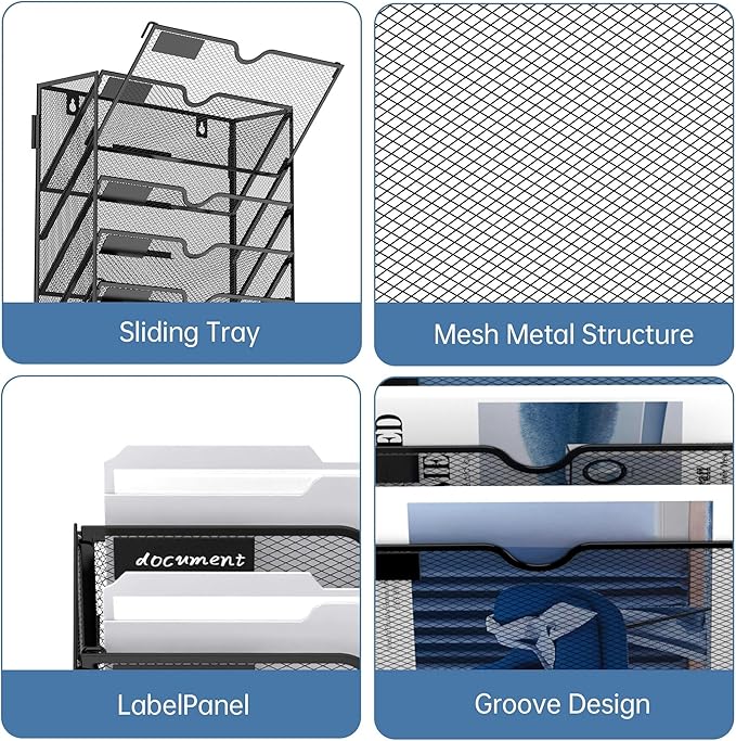 - [Clever Design] You can easily archive bills, contracts or homework by convenient label panel. 10 curved file dividers keep documents accessible yet hidden. Our mesh paper organizer is easy to clean as well. It will be a great addition to your workspace.