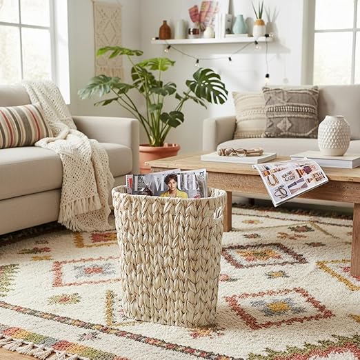 - STURDY, WATERPROOF EASY TO CLEAN♻️Crafted from high-quality woven polypropylene and reinforced with a sturdy metal frame, our wicker trash basket is built to last. Its tight and uniform weave not only adds to its durable construction but also ensures easy cleaning. Unlike traditional wicker, our material is waterproof and boasts a sleek, silk-like appearance without sharp edges, making it a breeze to wipe clean.