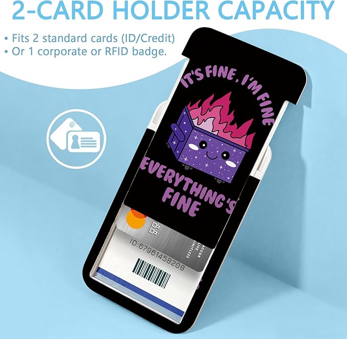 - Novelty Design: This cute badge reel features funny purple dumpster on fire art with the slogan "I'm Fine, It's Fine, Everything is Fine." The set includes a detachable lanyard, heavy-duty badge reel, and card holder, great for adding personality to your work accessories