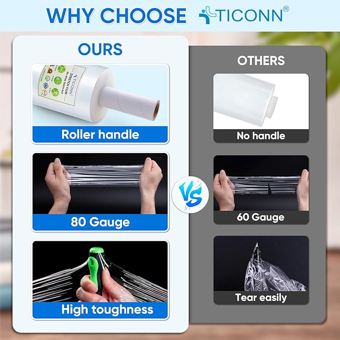 - [PREMIUM QUALITY] Our stretch film inherited the superior quality of other TICONN moving supplies. The plastic wrap is made from thick no odor industrial strength material