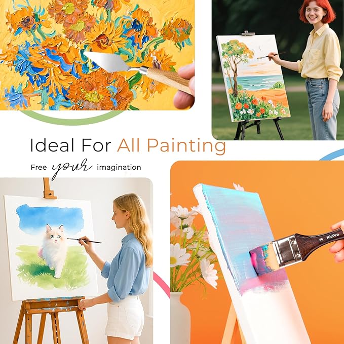 - For All Types of Painting: This professional paint brush set works perfectly for all mediums like acrylic painting, oil paints and watercolor, also great for detailing crafts, canvas painting and large coat applications, creating a vibrant work of art. Ideal for artist of all levels. Nicpro takes everyone on an artistic journey