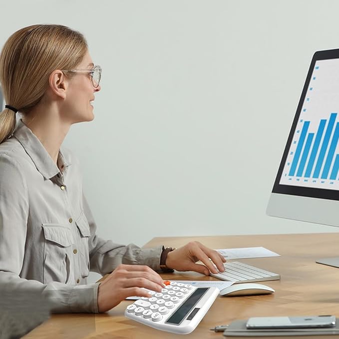 - Quality & Appearance- Calculator large display for women is made of durable ABS to ensure normal daily use. The typewriter-style clean lines and retro round keys and reasonable button layout make it beautiful and practical, perfect size, fits right on the desk and does all you need in a tight spot.