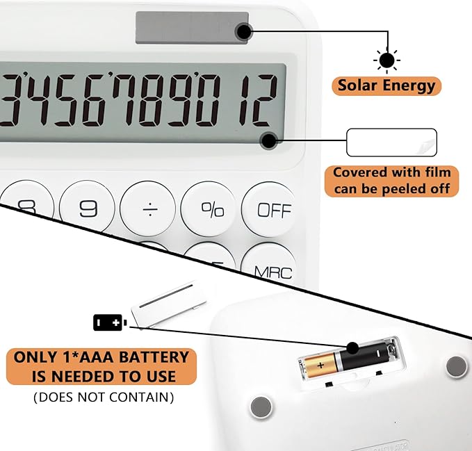 - Dual Power Calculator - Electric digital white calculator has dual electric drive, light energy and 1*AAA battery(not included); It can switch the power mode according to the environment, which is more durable and more convenient. The solar panel, as long as you use it in a lit environment, will power up the calculator thoroughly.