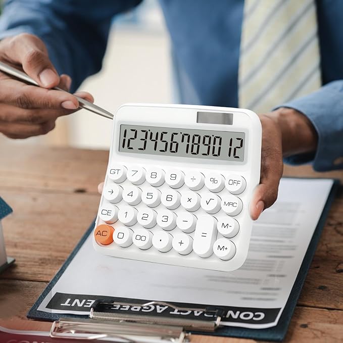 White Calculator, Standard Calculator 12 Digit with Large LCD Display and Big Buttons, White Office Supplies and Desk Accessories for Home, Office, School, Class and Business