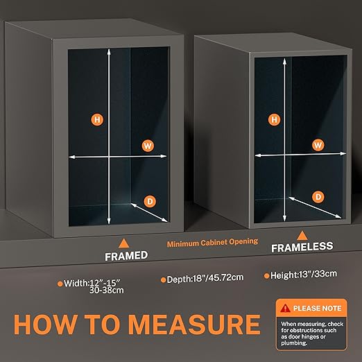 - Cabinet Requirements: Cabinet trash can pull out kit: 11" W x 16" D x 13" H; Minimum Cabinet Dimensions Required:12" Wx 18" Dx 13" H. Note:The height of the trash can slider for kitchen cabinet sliding rail frame of the cabinet door should be measured according to the height of the buyer's trash can.The door mounting kit is mounted to the front of the slide frame on both sides and requires a separate tool to remove.