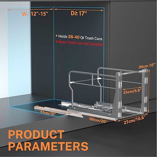 - Premiun Material: Trash can cabinet pull out is made of high-quality carbon steel with powder-coating surface for durability and rust resistance, allowing you to clean it with a cloth. Made for a trash can kitchen of 28 to 40 quarts (7β10 gal, 26β37 l) in volume, the frame can carry 100 pounds, 50 pounds more than regular slides.